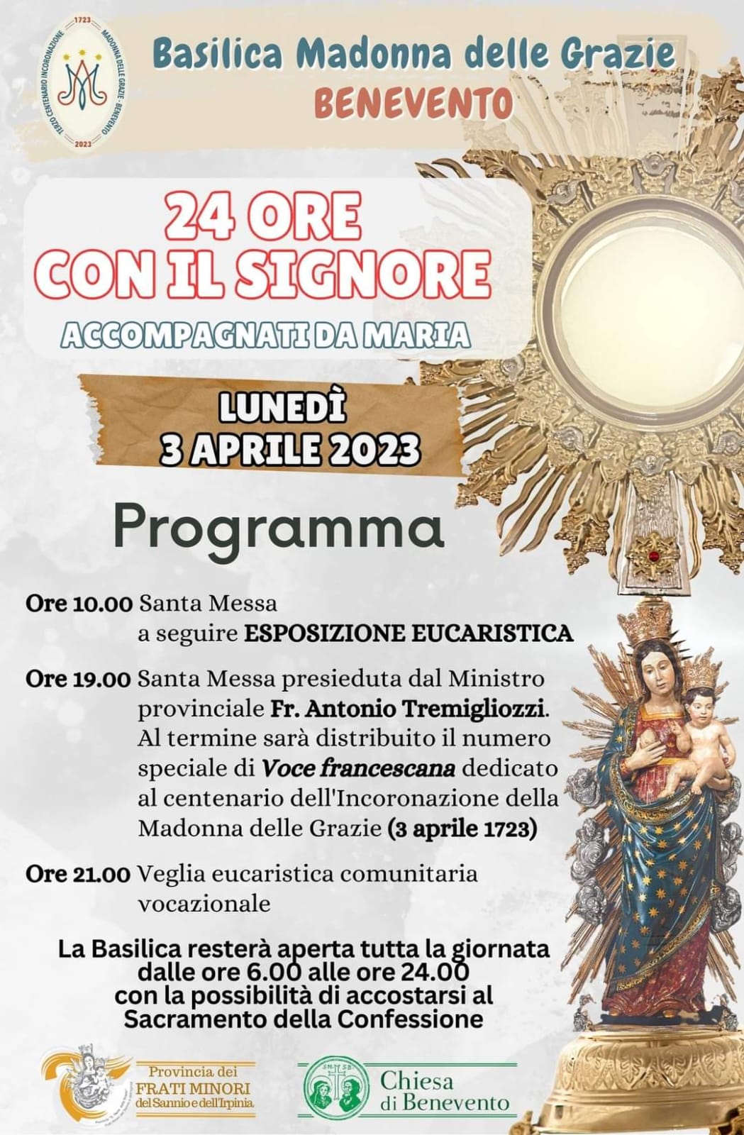 Per celebrare tale avvenimento, il prossimo lunedì 3 aprile la Basilica della Madonna delle Grazie sarà aperta tutta la giornata (dalle ore 6.00 alle 24.00) per l’iniziativa “24 ore con il Signore accompagnati da Maria”, con la possibilità di accostarsi al sacramento della riconciliazione. Alle ore 19.00 il Ministro provinciale dei Frati Minori Fr. Antonio Tremigliozzi presiederà la Celebrazione eucaristica, al termine della quale sarà presentato e distribuito il numero speciale del trimestrale “Voce francescana”, curato da Fr. Davide Panella, dedicato al terzo Centenario dell’Incoronazione. La S. Messa si concluderà con la recita della preghiera composta per l’occasione dall’Arcivescovo di Benevento, S. E. Mons. Felice Accrocca. Alle ore 21.00 inizierà la Veglia vocazionale penitenziale.