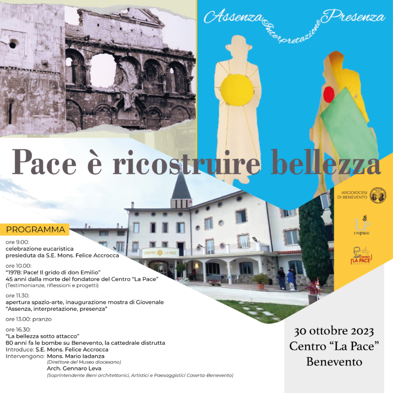 “La pace costruisce bellezza” è il tema della Giornata per la pace che si svolgerà lunedì 30 ottobre, a partire dalle ore 9, al Centro “La Pace”. L’iniziativa, oltre che dallo stesso Centro, è promossa da UNIpace e dall’Arcidiocesi di Benevento. Si tratta di un evento che conterrà tre momenti distinti, nei quali si alterneranno riflessioni, preghiera, dialogo e proposte per la costruzione di un’autentica cultura di pace. Sono 180 i conflitti attualmente in atto nel mondo e tutti ci chiediamo, alle nostre latitudini e secondo le personali risorse, cosa possiamo fare per contribuire alla riconciliazione e alla pace. Per l’occasione saranno ricordate l’azione e l’attualità della testimonianza di don Emilio Matarazzo, fondatore del Centro “La Pace”, a 45 anni dalla sua morte e dall’annuncio della costruzione dell’importante opera oggi riferimento per la formazione e l’applicazione concreta dei concetti di pace, e gli 80 anni dai bombardamenti del secondo conflitto mondiale che devastarono la città (oltre duemila vittime civili) e nel corso dei quali venne distrutta anche la cattedrale. L’artista Giovenale inaugurerà una sua mostra dal titolo “Assenza, interpretazione, presenza” dedicata alla pace e all’azione svolta da don Emilio. Nel dettaglio il programma prevede, alle 9, la celebrazione eucaristica presieduta da S.E. mons. Felice Accrocca; alle 10: “1978: Pace! Il grido di don Emilio” (Testimonianze, riflessioni e progetti); alle 11.30 l’inaugurazione della mostra di Giovenale “Assenza, interpretazione, presenza”; alle 13 il pranzo; alle 16.30: “La bellezza sotto attacco” (80 anni fa le bombe su Benevento, la cattedrale distrutta) con l’introduzione dell’arcivescovo Felice Accrocca e gli interventi di mons. Mario Iadanza (direttore del Museo diocesano) e dell’arch. Gennaro Leva (Soprintendente Beni architettonici, artistici e paesaggistici Caserta-Benevento).