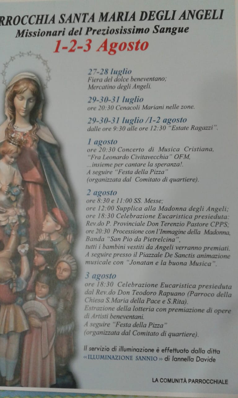 Parrocchia santa Maria degli Angeli in Benevento guidata dai missionari del Preziosissimo Sangue è in festa. Il 27 e 28 luglio fiera del dolce beneventano; e mercatino degli Angeli. 29, 30 e 31 luglio alle ore 20,30 Cenacoli mariani nelle zone. Dal 29 luglio al 2 agosto alle ore 9,30 alle 12,30 “estate ragazzi”. Il primo agosto concerto di musica cristiana a seguire la “festa della pizza”. Il 2 agosto tre sante messe alle ore 8,30 e 11 e alle ore 12 supplica; mentre alle 18,30 celebrazione eucaristica presieduta da rev. padre provinciale Terenzio Pastore cpps, alle ore 20,30 processione con l’immagine della Madonna. Sabato 3 agosto alle ore 18,30 celebrazione eucaristica presieduta da rev. don Teodoro Rapuano, parroco di S. Maria della Pace e S. Rita, a seguire “festa della pizza”.