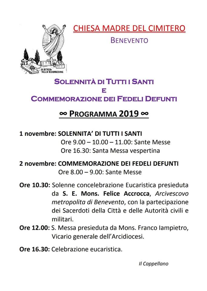 Venerdì 1° novembre solennità di tutti i Santi nella chiesa del cimitero di Benevento saranno celebrate quattro messe: alle ore 9, 10, 11 e 16,30. Sabato 2 novembre è il giorno tradizionalmente dedicato alla commemorazione dei defunti. L’arcivescovo, mons. Felice Accrocca, alle ore 10,30, presiederà la solenne concelebrazione eucaristica con la partecipazione dei sacerdoti della città e delle autorità civile e militari. Mentre alle ore 12 la santa messa sarà presieduta da mons. Francesco Iampietro, vicario generale dell’Arcidiocesi di Benevento, in programma alle ore 16,30 un’altra celebrazione eucaristica.