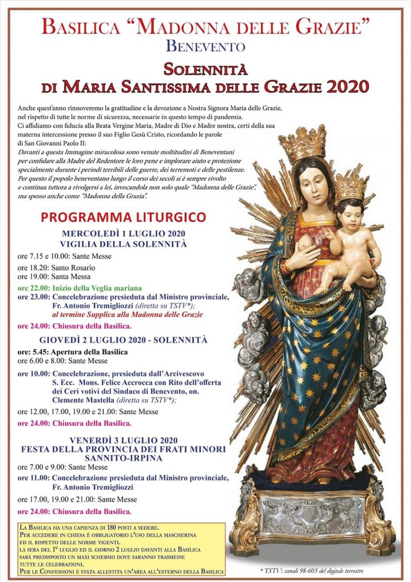 La festa della Madonna delle Grazie, Patrona di Benevento e Regina del Sannio, vive il suo clou come da tradizione secolare nei giorni 1, 2 e 3 luglio. Presso la Basilica di viale San Lorenzo, retta dai frati minori francescani, è già incessante il pellegrinaggio di fedeli provenienti da ogni comunità del Sannio e dell’Irpinia. Sul manifesto tutto il programma liturgico….