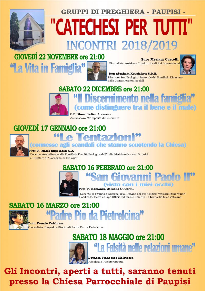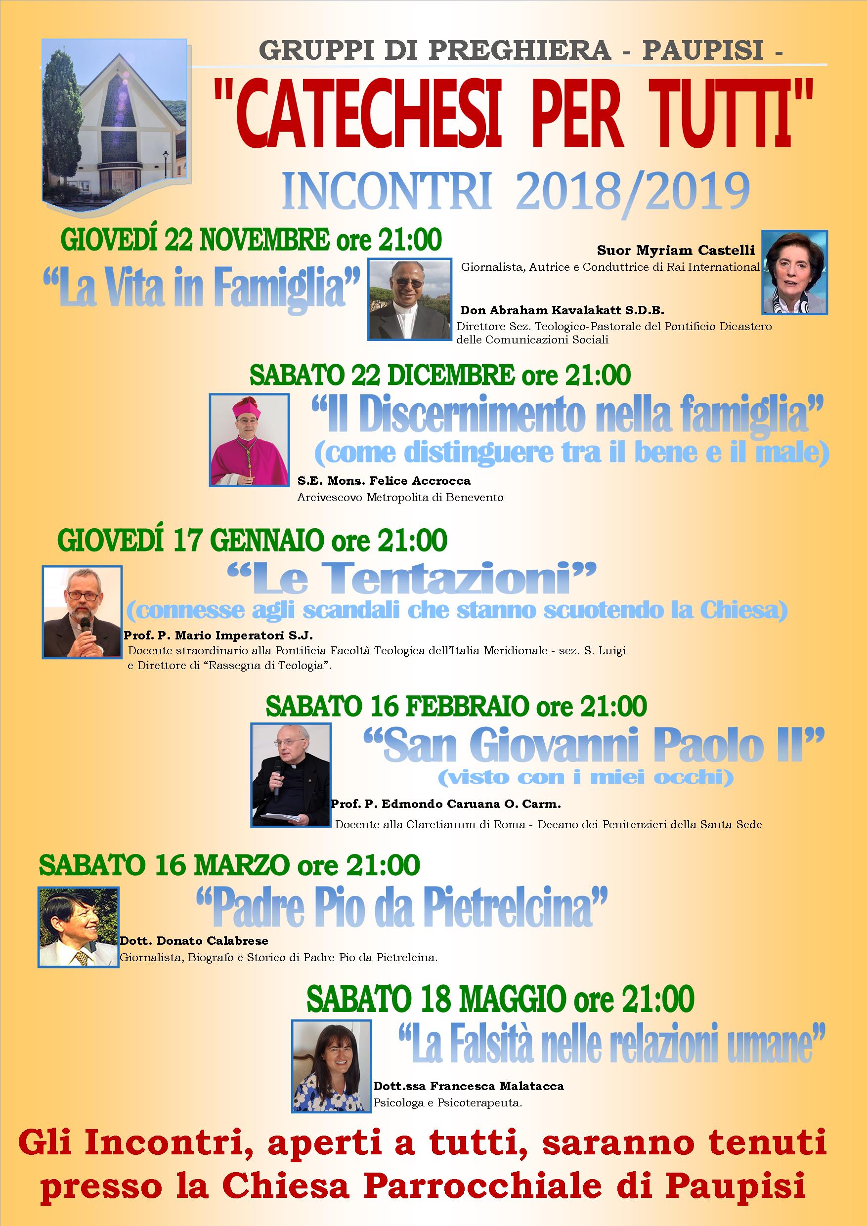Giovedì 22 novembre alle ore 21 si svolgerà nella chiesa di Paupisi l’incontro tra famiglie, nel quale don Abraham Kavalakatt (direttore Sezione Teologico-Pastorale del Pontificio Dicastero Comunicazioni Sociali) e suor Myriam Castelli (giornalista, autrice e conduttrice della Rai Internazionale) ci aiuteranno a riflettere e a confrontarci sulla “vita in famiglia”.