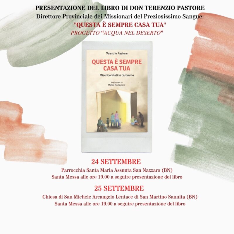 Presentazione del libro di don Terenzio Pastore, direttore provinciale dei Missionari del Preziosissimo Sangue: “Questa è sempre casa tua” il 24 settembre nella parrocchia S. Maria Assunta di San Nazzaro alle ore 19 dopo la santa messa; il 25 settembre nella chiesa di San Michele arcangelo di Lentace dopo la santa messa.