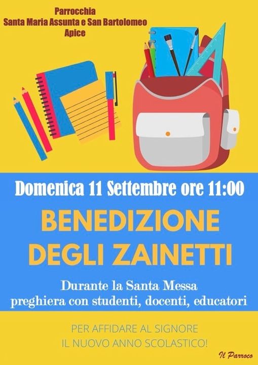 L’anno scolastico si può attendere in tanti modi: il più comune è fare la corsa alle iscrizioni, ai libri, al materiale didattico. La parrocchia santa Maria Assunta e san Bartolomeo di Apice non tralascia un aspetto importante alla vigilia di un nuovo anno: la benedizione degli zainetti. Domenica 11 settembre alle ore 11, durante la s. messa, sarà invocato lo Spirito santo su tutti coloro che fanno parte della grande famiglia della scuola: alunni, alunne, personale docente e tecnico-amministrativo. Niente di meglio per affrontare insieme una sfida educativa ancora più impegnativa, dal momento che si deve superare il disagio provocato da due anni di pandemia.