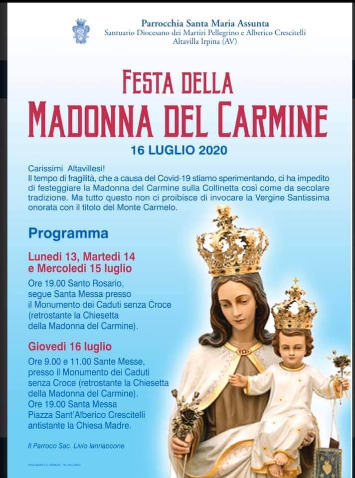 Altavilla, festa della Madonna del Carmine Don Livio Iannaccone, parroco della parrocchia Santa Maria Assunta in Altavilla Irpina Av, ha preparato il programma per la festa della Madonna del Carmine…. vedi il manifesto