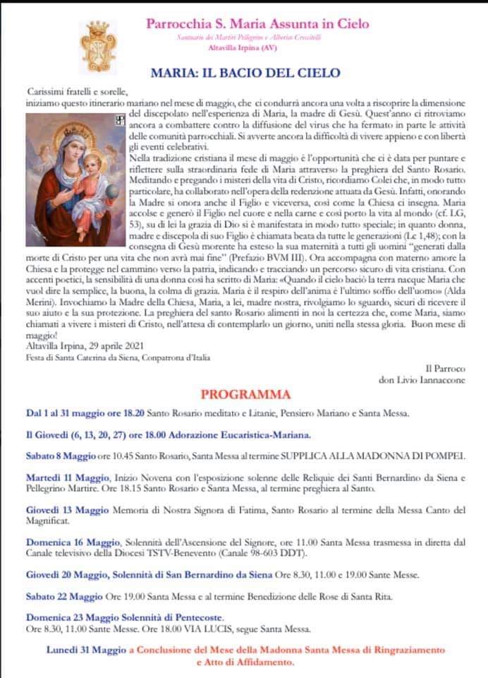 Altavilla Irpina, ecco il mese mariano La parrocchia S. Maria Assunta in Altavilla Irpina , guidata dal parroco don Livio Iannacone, ha programmato un mese mariano ricco di eventi spirituali… Vedi il manifesto