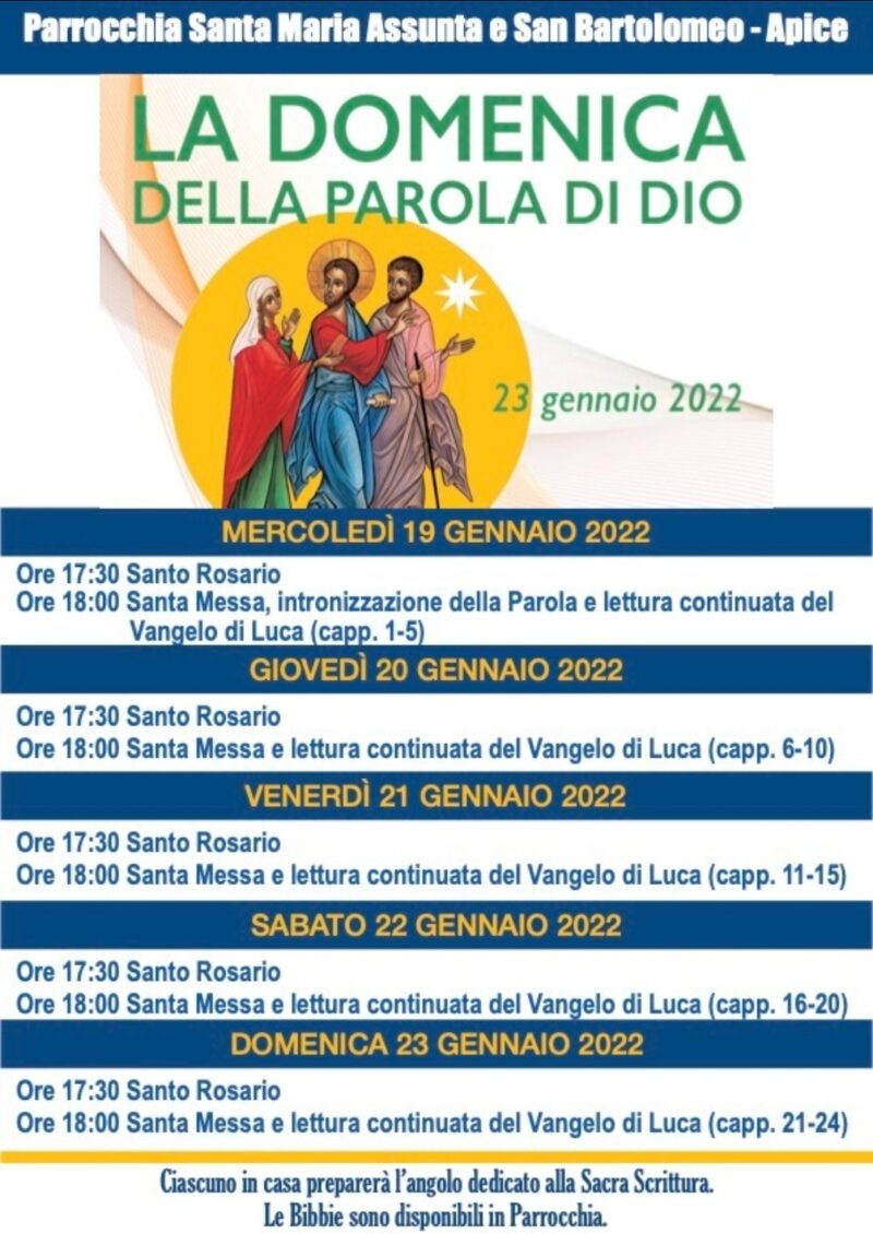 Apice: Domenica della Parola di Dio Nella parrocchia S. Maria Assunta e S. Bartolomeo di Apice iniziative per la Domenica della Parola di Dio. Per il programma vedi il manifesto…