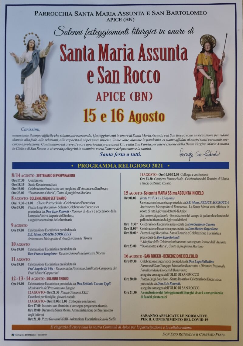 Apice festeggia S. Maria Assunta e S. Rocco La parrocchia Santa Maria Assunta e San Bartolomeo di Apice si prepara a vivere i solenni festeggianti liturgici in onore di Santa Maria Assunta e San Rocco. Per il programma vedi il manifesto…