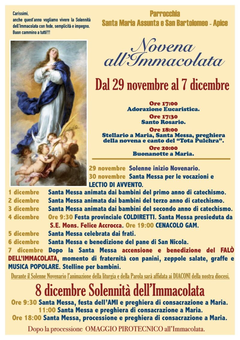 Apice: novena dell’Immacolata Nella parrocchia S. Maria Assunta e S. Bartolomeo di Apice dal 29 novembre al 7 dicembre novena dell’Immacolata. Per gli orari vedi il manifesto…