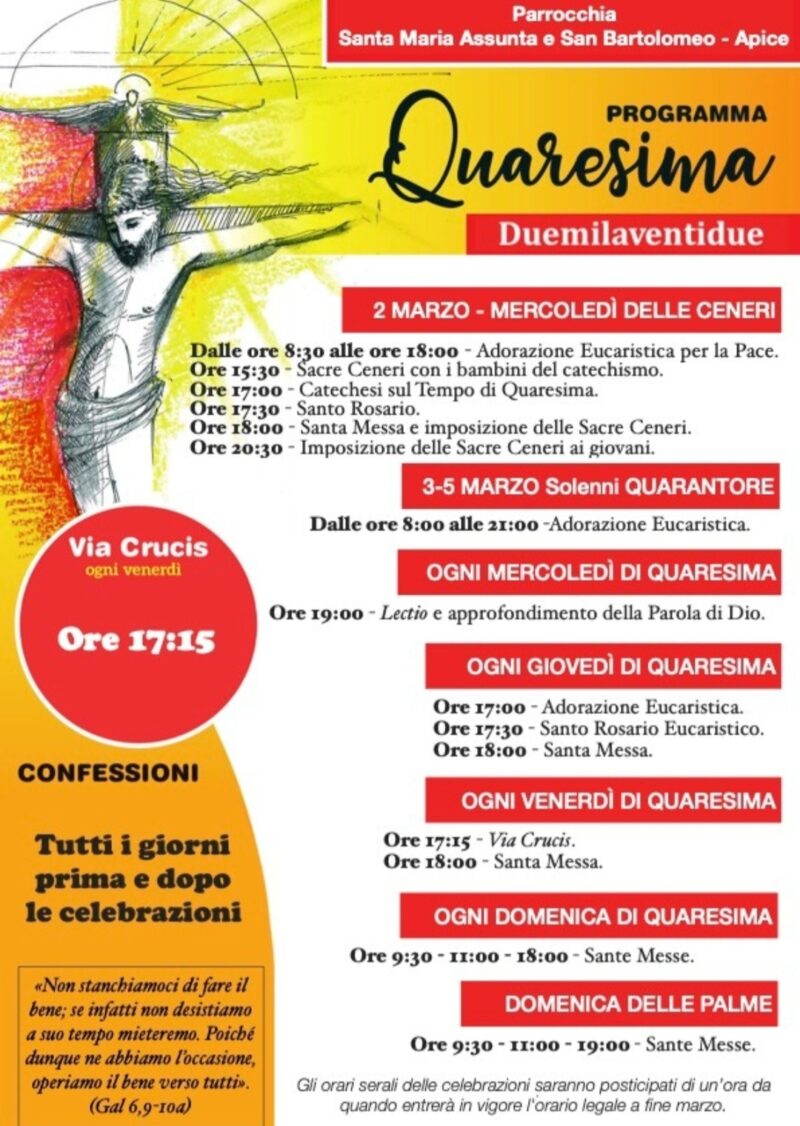 Apice: Quaresima 2022 La parrocchia S. Maria Assunta e S. Bartolomeo di Apice un percorso spirituale per la Quaresima 2022. Per il programma vedi il manifesto…