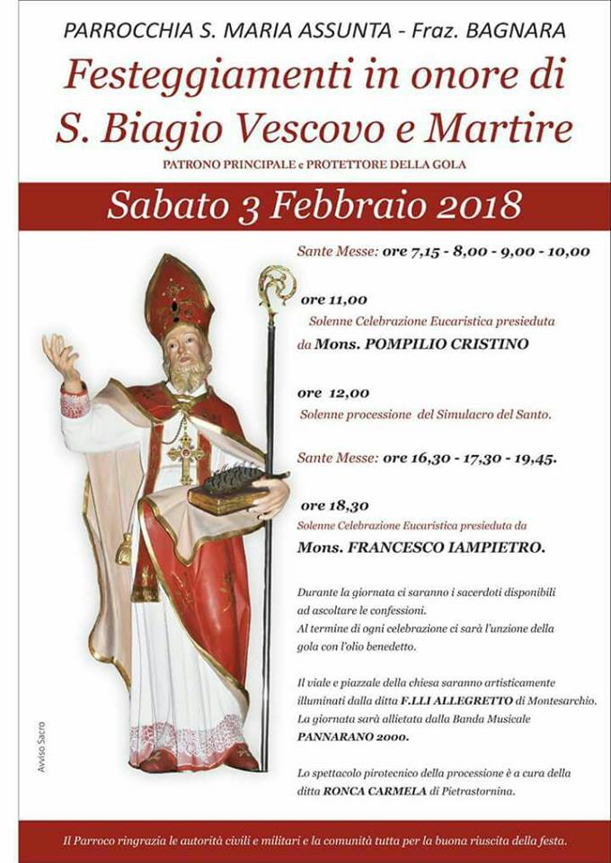 Il 3 febbraio sarà un giorno di festa per la parrocchia Santa Maria Assunta di Bagnara. Nella frazione di Sant’Angelo a Cupolo, la comunità parrocchiale guidata dal parroco don Antonio Bonavita, è pronta per festeggiare il santo patrono: San Biagio. Saranno celebrate nove messe alle ore 7,15; 8; 9; 10; 16,30; 17,30 e 19,45 . La celebrazione eucaristica delle 11 sarà presieduta da mons. Pompilio Cristino a seguire la processione con il simulacro del santo per le vie del paese; mentre nel pomeriggio, alle 18, 30, la solenne celebrazione eucaristica, sarà presieduta da mons. Francesco Iampietro, vicario generale dell’arcidiocesi sannita. Unzione della gola con olio benedetto dopo ogni celebrazione eucaristica.