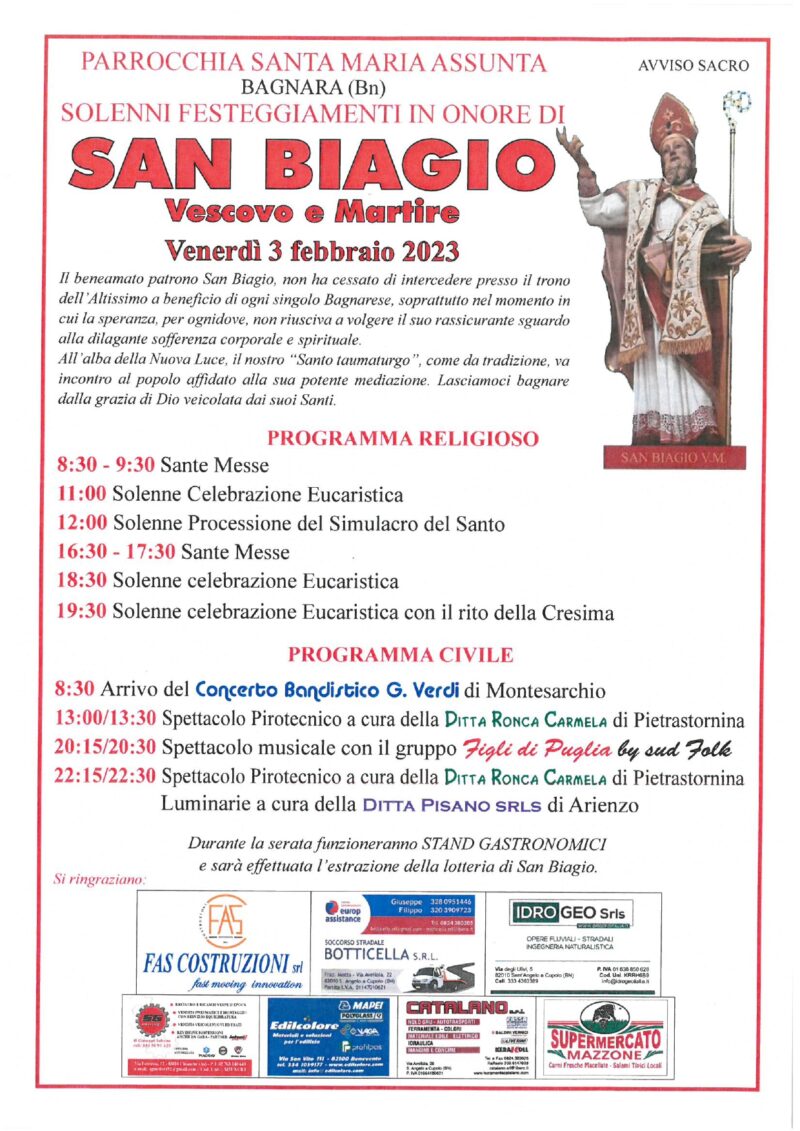 Venerdì 3 febbraio 2023 sarà un giorno di festa per la parrocchia Santa Maria Assunta di Bagnara. Nella frazione di Sant’Angelo a Cupolo, la comunità parrocchiale guidata dal parroco don Antonio Bonavita, è pronta per festeggiare il santo patrono: San Biagio. Per il programma vedi il manifesto…