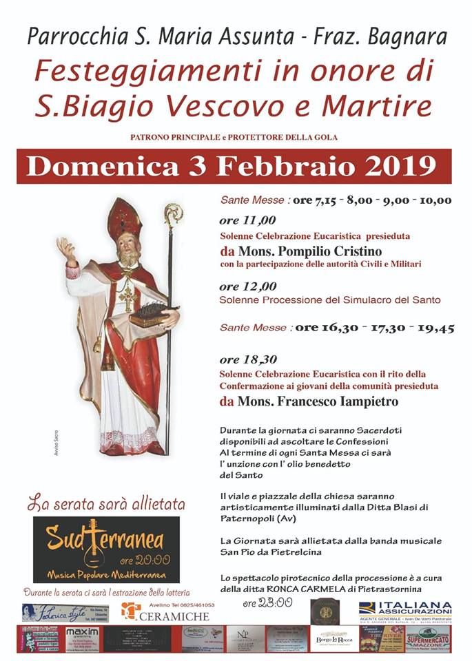 La grotta di san Biagio a Bagnara all’inizio del centro urbano è da alcuni anni meta prediletta sia dei devoti pellegrini in cerca di ristoro spirituale sia di chi è attratto dalla storia del vescovo-santo. «La ricostruzione della grotta – afferma don Antonio Bonavita, parroco di Bagnara –    una vera testimonianza della continuità in zona dei luoghi di culto rupestri fin dall’antichità;  è così si rivive un viaggio di fede e preghiera». Opere e segni parlano della devozione per il protettore della gola. La frazione di Sant’Angelo a Cupolo si prepara a vivere i festeggiamenti che si svolgeranno domenica 3 febbraio. In programma nove sante messe alle ore 7,15; 8; 9; 10; 11; 16,30; 17,30; 18,30 e 19,45. La celebrazione eucaristica delle ore 11 sarà presieduta da monsignor Pompilio Cristino con la partecipazione delle autorità civili e militari, seguirà la processione per le vie di Bagnara. In serata, ore 18,30, si svolgerà la celebrazione eucaristica con il sacramento della Confermazione ai giovani della comunità presieduta da monsignor Francesco Iampietro, vicario generale dell’Arcidiocesi di Benevento. Al termine di ogni santa messa ci sarà l’unzione con l’olio benedetto del santo protettore della gola.