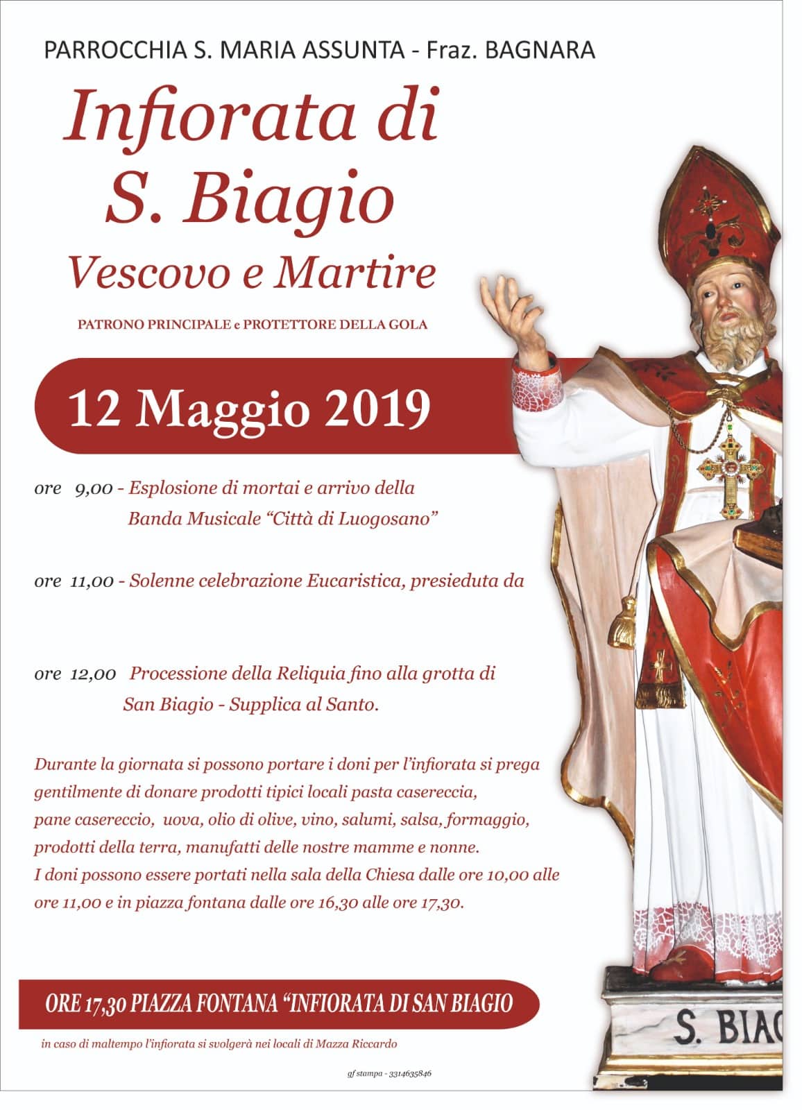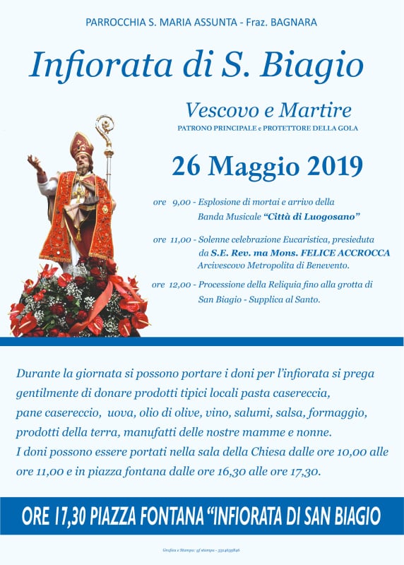 Infiorata di S. Biagio La parrocchia Santa Maria Assunta in Bagnara ha organizzato, per domenica 26 maggio, l’infiorata di S.Biagio. Vedi il programma della giornata sul manifesto allegato… 59429631_324918051536983_2121279051799724032_n