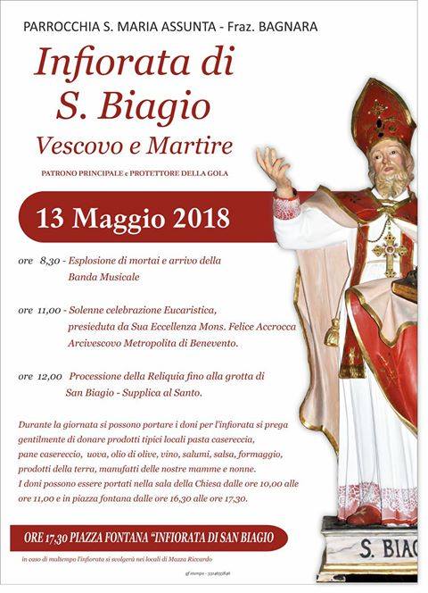 La parrocchia Santa Maria Assunta di Bagnara, guidata dal parocco don Antonio Bonavita, ha organizzato per domenica 13 maggio alle ore 17,30 l’infiorata di San Biagiio. La giornata iniza con l’esplosione dei mortai e arrivo della banda musicale; alle ore 11 solenne celebrazione eucaristica presieduta dall’arcivescovo mons. Felice Accrocca e alle ore 12 processione della reliquia del santo fino alla grotta di san Biagio e supplica.