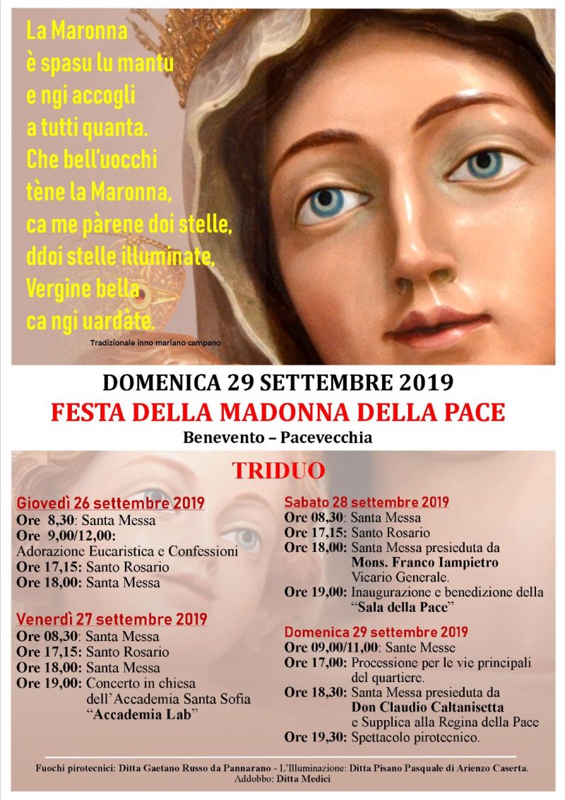 Nella parrocchia Santa Maria della Pace in città domenica 29 settembre si festeggerà la Madonna della Pace. Il parroco, don Teodoro Rapuano, ha stilato un ricco programma per questa festa. Il triduo inizierà giovedi 26 settembre con l’adorazione eucaristica e confessioni alle ore 9 e 12; mentre la santa messa alle ore 18. Venerdì 27 settembre, alle ore 19, concerto in chiesa dell’Accademia Santa Sofia “Accademia Lab”. Sabato 28 settembre, dopo la santa messa delle ore 18, che sarà celebrata dal vicario generale mons. Francesco Iampietro, ci sarà l’inaugurazione e la benedizione della “Sala della Pace”. Domenica, 29 settembre, saranno celebrate tre messe alle ore 9, 11 e 18,30; la processione per le vie principali del quartiere è in programma alle ore 17 e alle 19 la supplica alla Regina della Pace; alle ore 19,30 spettacolo di fuochi pirotecnici.