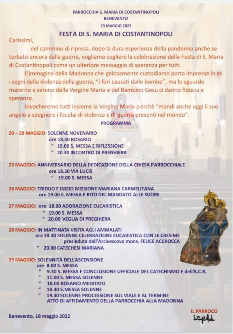 Benevento, festa di S. Maria di Costantinopoli Festa il 29 maggio 2022 nella parrocchia di Santa Maria di Costantinopoli in Benevento. Per il programma vedi il manifesto…