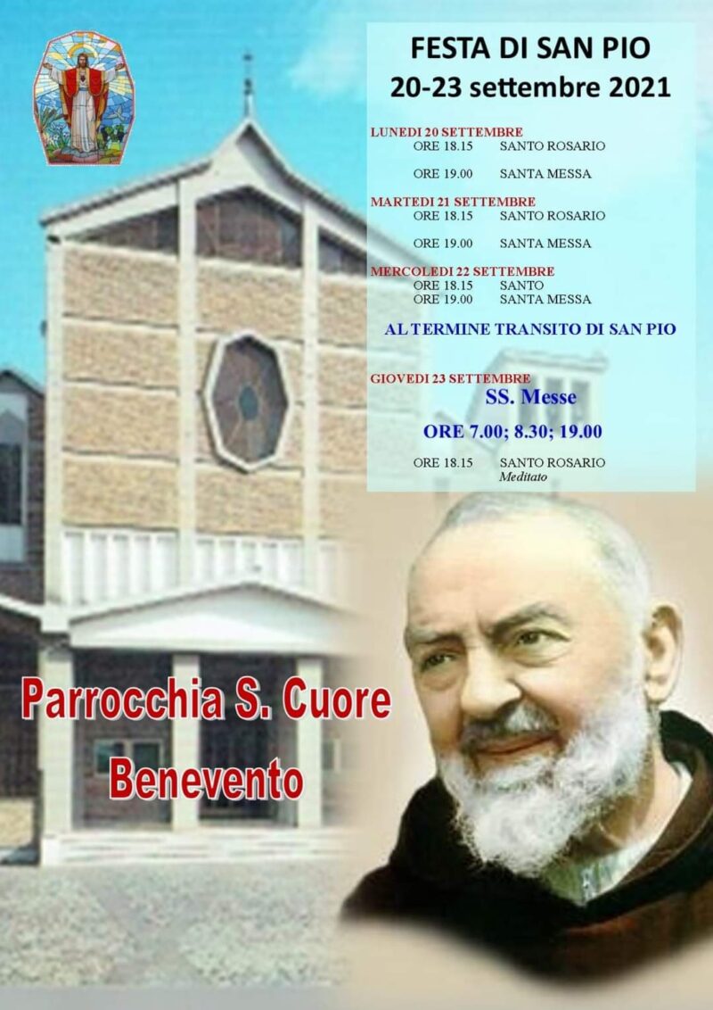 Benevento festa religiosa di San Pio La Parrocchia “San Cuore” in Benevento ha reso noto il programma religioso in occasione dei festeggiamenti in onore di San Pio da Pietrelcina. Per il programma vedi il manifesto…
