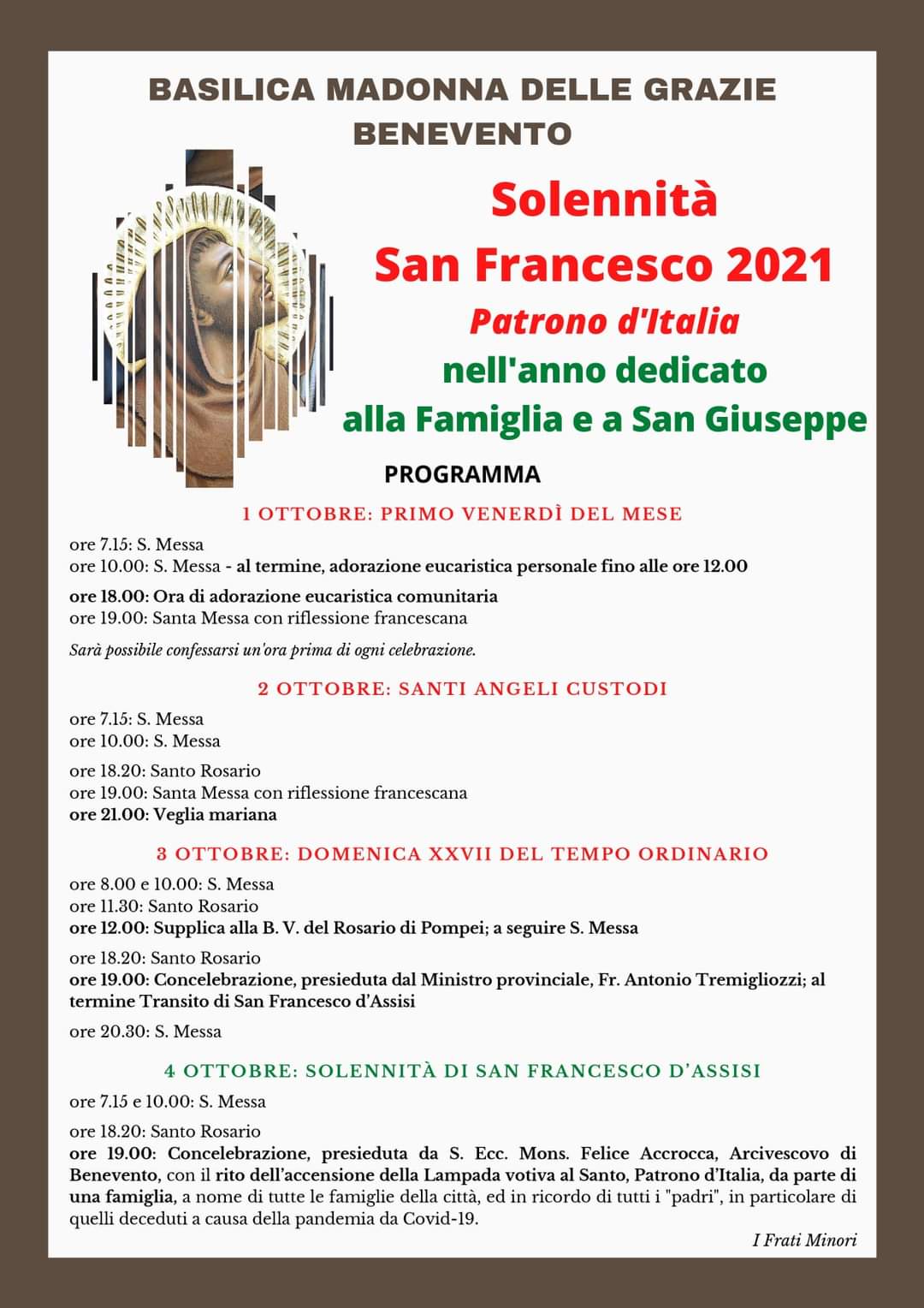 Il papa Pio XII proclamando patrono principale d’Italia San Francesco d’Assisi, il 18 giugno 1939, lo definì «il più italiano dei santi e più santo degli italiani». Il legame che unisce Benevento alla figura del santo patrono primario d’Italia e dell’ecologia si rafforza in questi giorni. La festa del “poverello d’Assisi” è molto sentita nell’intero Sannio. Vedi il programma allegato delle celebrazioni presso la Basilica della Madonna delle Grazie in Benevento per il patrono d’Italia…