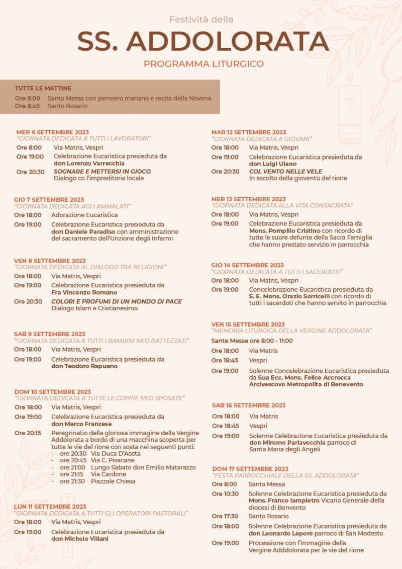 Benevento, la parrocchia SS. Addolorata in festa La parrocchia SS. Addolorata di Benevento in festa dal 6 al 17 settembre 2023. Per il programma vedi il manifesto…