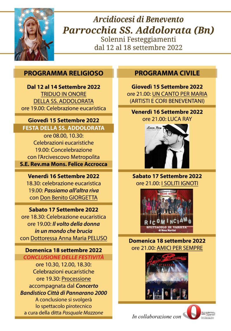 Benevento, la parrocchia SS. Addolorata in festa La parrocchia SS. Addolorata di Benevento in festa dal 12 al 18 settembre. Per il programma vedi il manifesto…