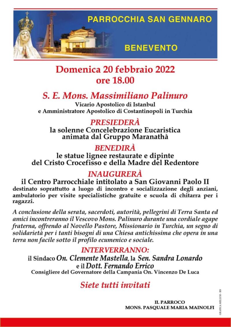 Nella parrocchia S. Gennaro di Benevento, domenica 20 febbraio alle ore 20, mons. Massimiliano Palinuro vicario apostolico di Istanbul e amministratore apostolico di Costantinopoli in Turchia presiederà la solenne concelebrazione eucaristica e benedirà le statue restaurate e dipinte. Per il programma vedi il manifesto…