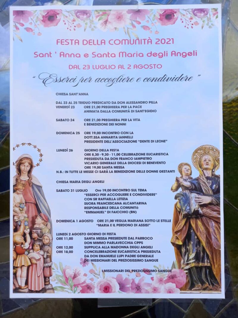 I missionari del Preziosissimo Sangue hanno organizzato la festa della Comunità 2021 di S. Anna e S.Maria degli Angeli in Benevento. La festa dal titolo: “Esserci per accogliere e condividere” è in programma dal 23 luglio al 2 agosto. Per il programma vedi il manifesto…