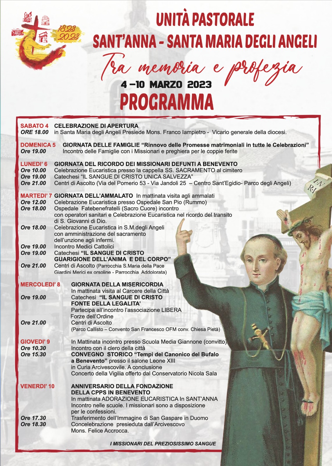 A Benevento si celebra il Giubileo straordinario per i 200 anni della presenza nel capoluogo sannita dei Missionari del Preziosissimo Sangue. Per l’occasione l’Unità Pastorale Sant’Anna – Santa Maria deli Angeli ha stilato un ricco programma dal titolo “Tra memoria e profezia”, dal 4 al 10 marzo 2023. L’evento di apertura si vivrà sabato 4 marzo, alle ore 18, con la santa messa nella parrocchia Santa Maria degli Angeli presieduta da mons. Franco Iampietro , vicario generale dell’ arcidiocesi di Benevento; mentre domenica 5 marzo ci sarà la giornata delle famiglie con il rinnovo delle promesse matrimoniali in tutte le celebrazioni e alle ore 19 nella chiesa di Santa Maria deli Angeli incontro con le famiglie con i Missionari e preghiera per le coppie ferite. Tutti i fedeli che, fino al 6 gennaio 2024, visiteranno le parrocchie di Sant’Anna e Sana Maria degli Angeli potranno ottenere il dono dell’indulgenza parziale. L’intero anno sarà contraddistinto anche da eventi culturali e da numerose iniziative per diffondere e valorizzare il lavoro svolto dai missionari a Benevento.