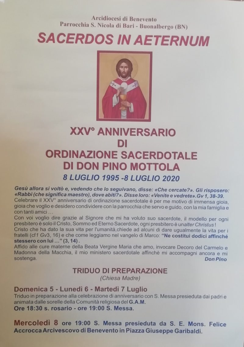 “Gesù allora si voltò e, vedendo che lo seguivano, disse: «Che cercate?». Gli risposero: «Rabbì (maestro), dove abiti?». Disse loro: «Venite e vedrete». Con queste parole del Vangelo di Giovanni (Gv 1, 38-39), il Parroco di San Nicola di Bari di Buonalbergo, don Pino Mottola, introduce il programma religioso delle celebrazioni del suo venticinquesimo anniversario di sacerdozio che ricorrerà il prossimo mercoledì 8 luglio. Don Mottola continua nella lettera alla comunità: “celebrare il XXV° anniversario di ordinazione sacerdotale è per me motivo di immensa gioia, gioia che voglio e desidero condividere con la parrocchia che servo e guido, con la mia famiglia e con tanti amici. Con voi voglio dire grazie al Signore che mi ha voluto suo sacerdote, il modello per ogni presbitero è solo il Cristo, Sommo ed Eterno Sacerdote, ogni presbitero è un alter Christus!”.