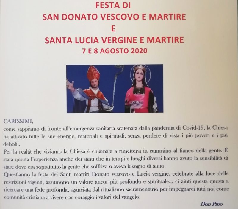 Quest’anno la festa dei Santi martiri Donato vescovo e Lucia vergine, celebrate alla luce delle restrizioni vigenti, assumono un valore ancor più profondo e spirituale. Ci aiuti questa a ricercare una fede profonda, sganciata dal ritualismo sacramentario per impegnarci tutti noi come comunità cristiana a vivere con coraggio i valori del Vangelo.