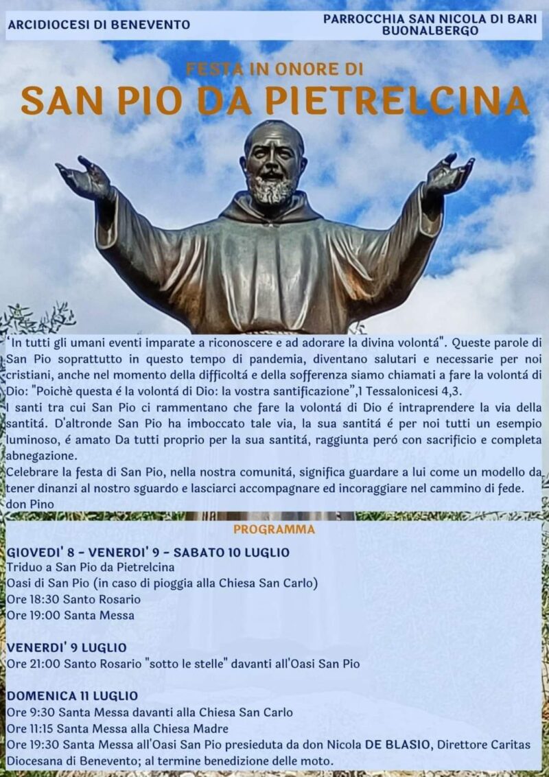 Buonalbergo, festa in onore di San Pio La parrocchia San Nicola di Bari di Buonalbergo ha organizzato la festa in onore di San Pio da Pietrelcina. Per il programma vedi il manifesto…