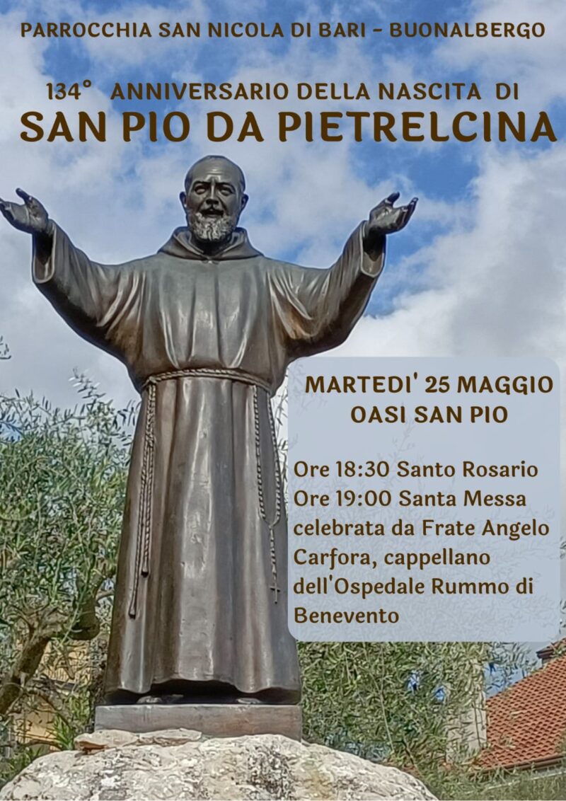 Buonalbergo ricorda San Pio da Pietrelcina A Buonalbergo si ricorda martedì 25 maggio il 134° anniversario della nascita di San Pio da Pietrelcina. Per il programma vedi il manifesto…