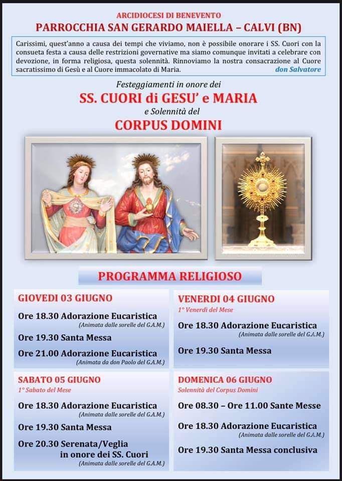 Calvi, festeggiamenti in onore dei SS. Cuori di Maria Dal 3 al 6 giugno a Calvi festeggiamenti in onore dei SS. Cuori di Maria. Per il programma vedi il manifesto…