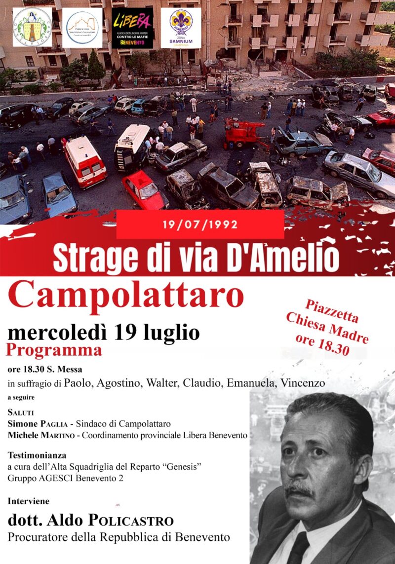 In occasione del XXXI anniversario della strage di via D’Amelio, il Procuratore della Repubblica presso il Tribunale di Benevento, dott. Aldo Policastro, visiterà la comunità di Campolattaro, nell’ambito di un’iniziativa organizzata dall’amministrazione comunale, la parrocchia, il coordinamento provinciale di Libera, l’AGESCI della Zona Samnium. Il programma si apre con la celebrazione della S. Messa in suffragio di Paolo, Agostino, Walter, Claudio, Emanuela, Vincenzo, caduti per mano