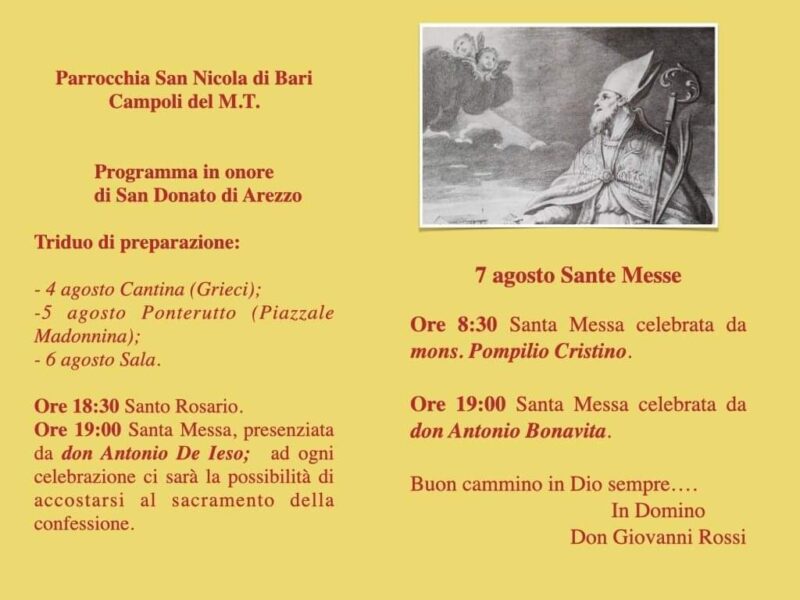 Campoli del Monte Taburno in festa per S. Donato La parrocchia San Nicola di Campoli del Monte Taburno festeggia S. Donato di Arezzo. Per il programma…