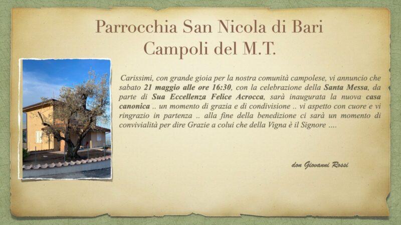 Campoli del Monte Taburno inaugurazione della casa canonica Sabato 21 maggio, alle ore16,30, a Campoli del Monte Taburno inaugurazione della casa canonica con la benedizione dell’arcivescovo mons. Felice Accrocca.