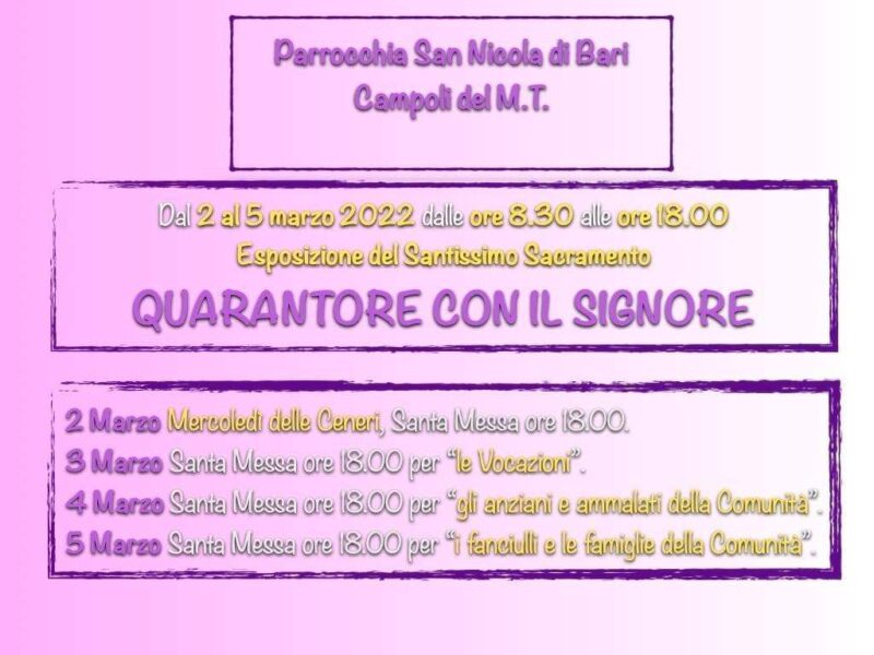 La parrocchia San Nicola di Bari in Campoli del Monte Taburno ha organizzato le quarantore con il Signore… per il programma vedi il manifesto