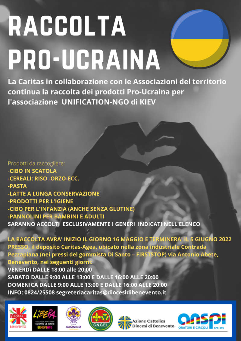 In data 6 maggio 2022 l’Associazione “ UNIFICATION – ONG” ha inviato alla Caritas di Benevento una richiesta di aiuti urgenti per la crisi umanitaria che la popolazione ucraina sta vivendo da oltre tre mesi. Dopo avere assunto informazioni circa la serietà e la fattiva operatività della Associazione, intendiamo rispondere alla chiamata di aiuti con una raccolta straordinaria dei seguenti prodotti :