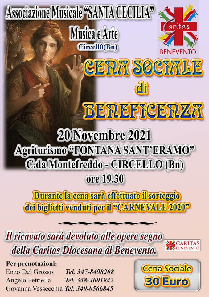 L’associazione musicale “Santa Cecilia” musica e arte di Circello ha organizzato una cena sociale di beneficenza,  il 20 novembre alle ore 19,30, presso l’agriturismo “Fontana Sant’Erasmo” a Contrada Montefreddo di Circello. Il ricavato sarà devoluto alle opere segno della Caritas di Benevento.