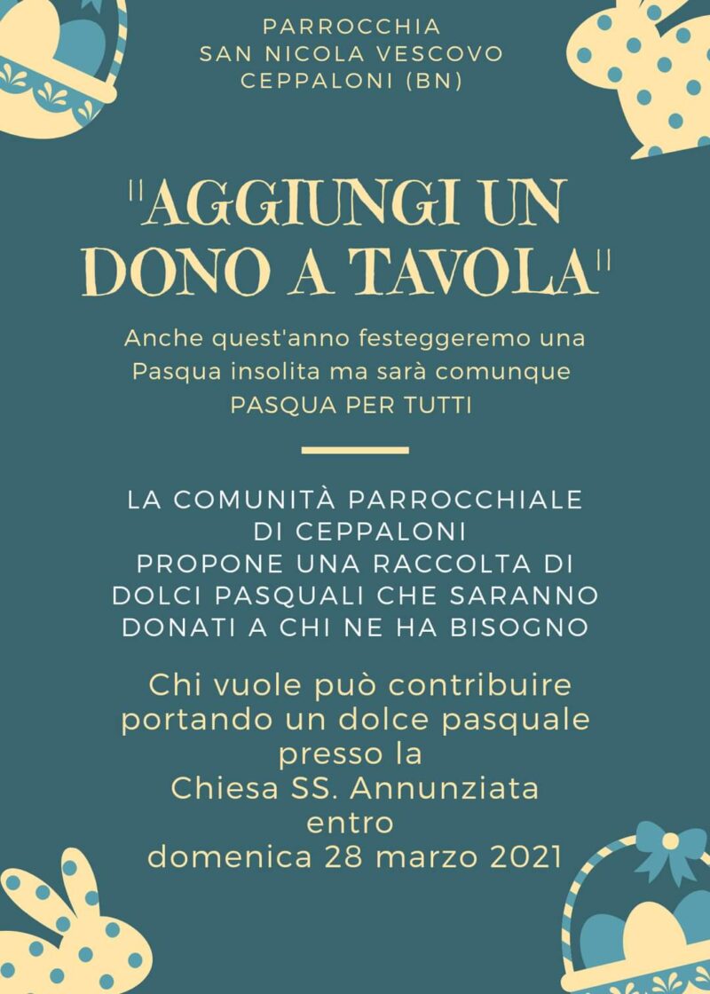 La comunità parrocchiale di Ceppaloni propone una raccolta di dolci pasquali che saranno donati a chi ne ha bisogno. Chi vuole può contribuire portando un dolce pasquale presso la chiesa SS. Annunziata entro domenica 28 marzo 2021.