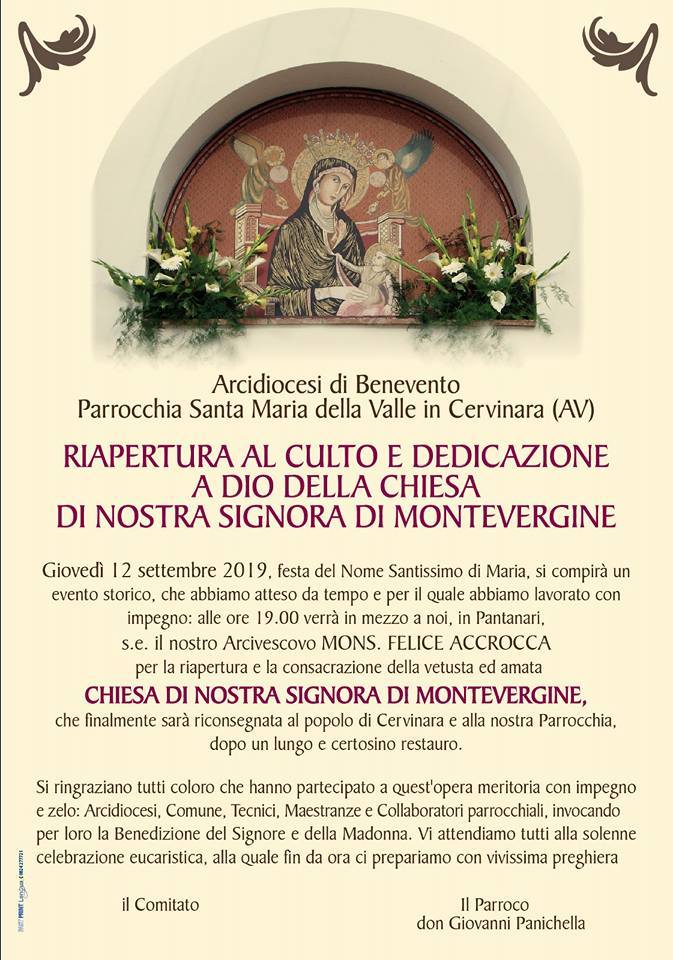 Giovedì 12 settembre alle ore 19 riapertura al culto e consacrazione della chiesa di nostra Signora di Montevergine della parrocchia Santa Maria della Valle in Cervinara. Il rito sarà presieduta dell’arcivescovo di Benevento mons.Felice Accrocca.
