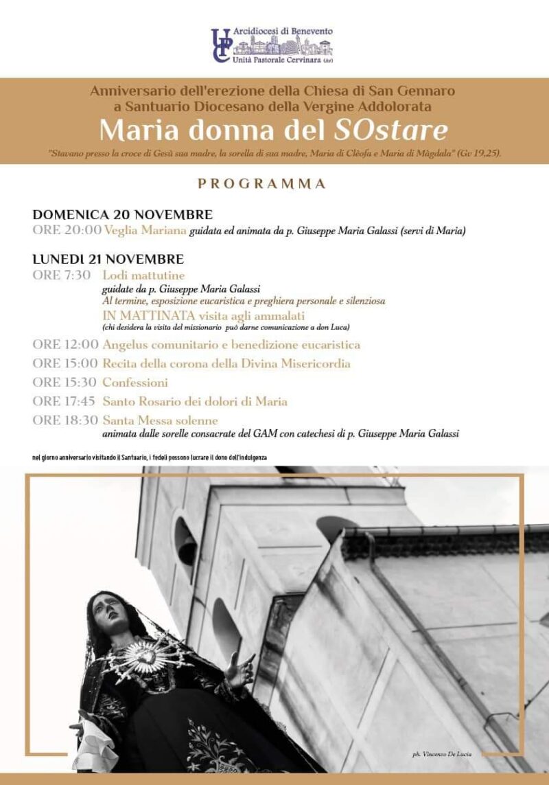 Cervinara: “Maria donna del SOstare” L’Unità Pastorale di Cervinara festeggia l’anniversario dell’erezione della chiesa di San Gennaro a Santuario Diocesano della Vergine Addolorata. Per il programma vedi il manifesto…