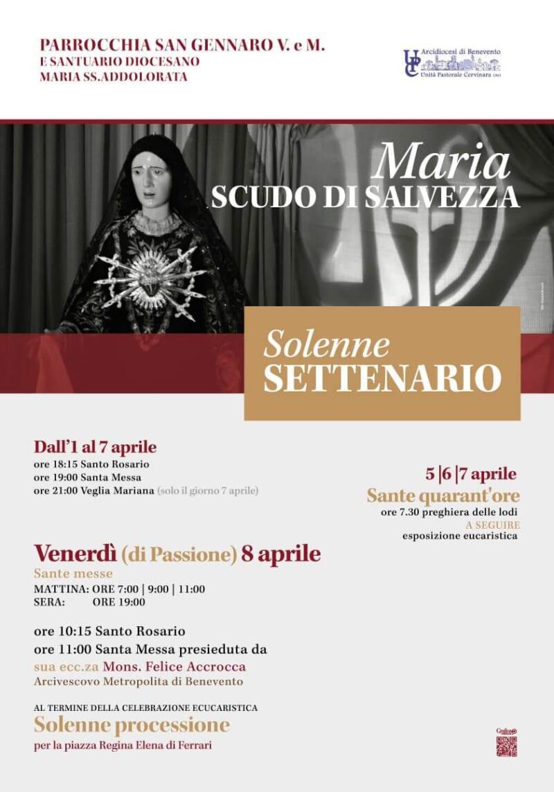 Cervinara: “Maria scudo di salvezza” Nella parrocchia San Gennaro e santuario diocesano Maria SS. Addolorata in Cervinara dall’1 al 7 aprile solenne settenario alla Madonna. Per il programma vedi il manifesto…