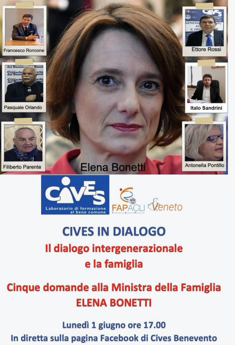 evento con la Ministra della famiglia Elena Bonetti. L’appuntamento digitale si inserisce nell’ambito del ciclo di iniziative CIVES IN DIALOGO, e avrà come tema: “Il dialogo intergenerazionale e la famiglia. Cinque domande alla Ministra della famiglia Elena Bonetti”.