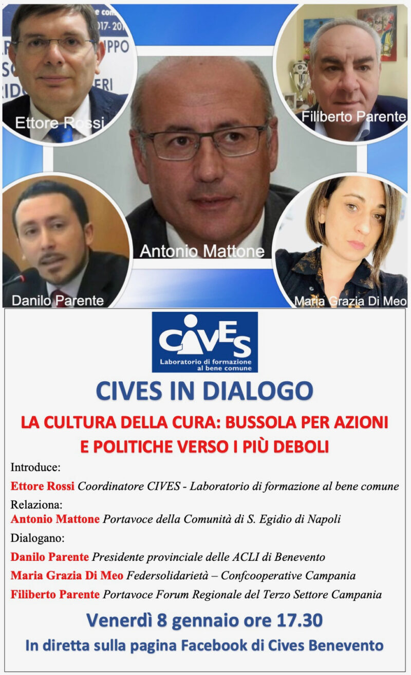 Venerdì 8 gennaio alle ore 17.30 CIVES – Laboratorio di formazione al bene comune, nell’ambito del ciclo di iniziative CIVES IN DIALOGO, proporrà un confronto in videoconferenza sul tema: “La cultura della cura: bussola per azioni e politiche verso i più deboli”.