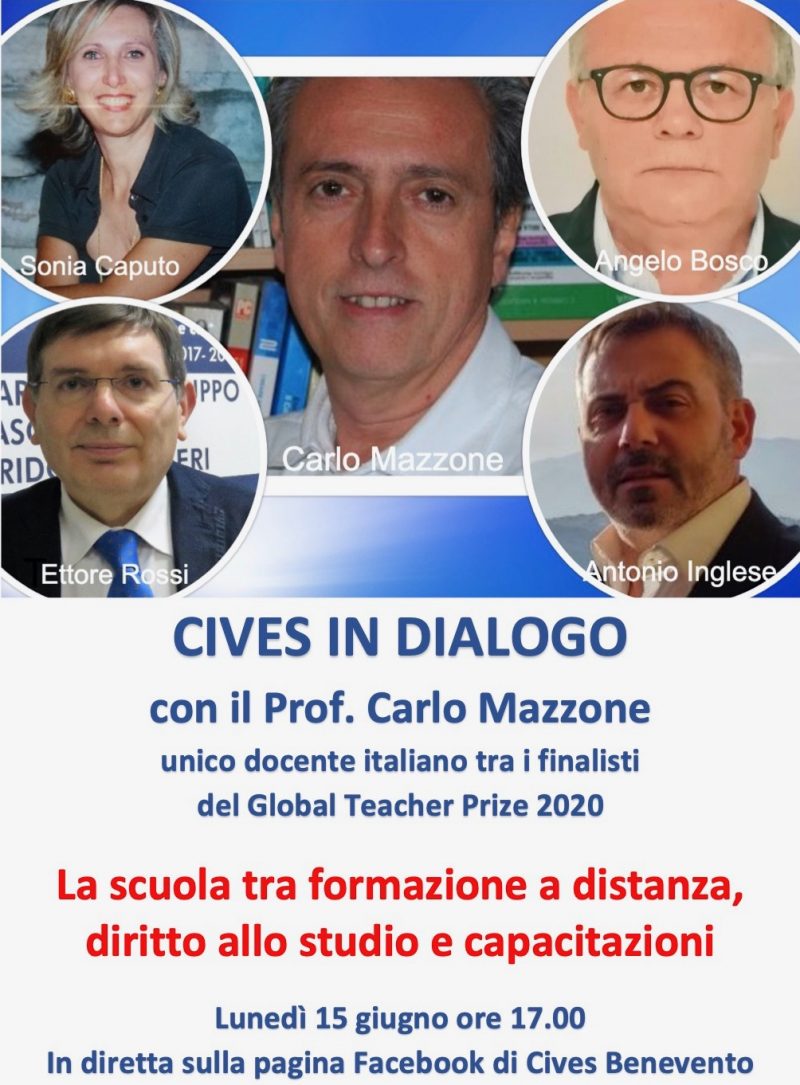 Introdurrà Ettore Rossi Coordinatore di CIVES. Dialogheranno con Carlo Mazzone unico docente italiano tra i finalisti del Global Teacher Prize 2020: Angelo Bosco docente del Liceo Classico “Pietro Giannone” di Benevento, Sonia Caputo docente del Liceo Scientifico “Gaetano Rummo” di Benevento e Antonio Inglese docente dell’Istituto Tecnico Industriale “G. B. Bosco Lucarelli” di Benevento.
