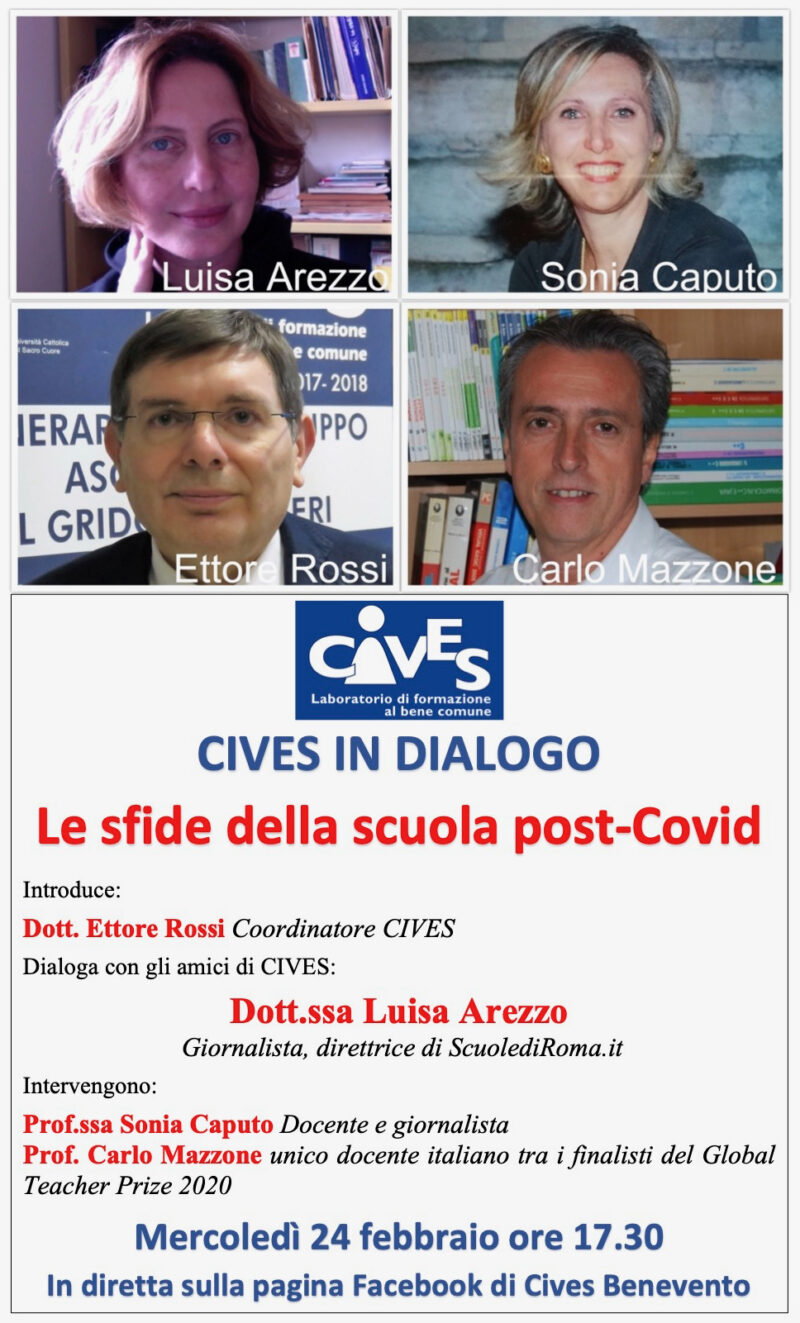 Mercoledì 24 febbraio alle ore 17.30 CIVES – Laboratorio di formazione al bene comune organizzerà la nona videoconferenza nell’ambito del nuovo ciclo di iniziative CIVES IN DIALOGO, proponendo un confronto con la Dott.ssa Luisa Arezzo giornalista, direttrice di ScuolediRoma.it e autrice di vari libri fra cui due testi-guida sugli Istituti capitolini, sul tema: “Le sfide della scuola post-Covid”. Ad introdurre il dialogo sarà il Dott. Ettore Rossi Coordinatore di CIVES. Interverranno la Prof.ssa Sonia Caputo docente e giornalista e il Prof. Carlo Mazzone unico docente italiano tra i finalisti del Global Teacher Prize 2020.