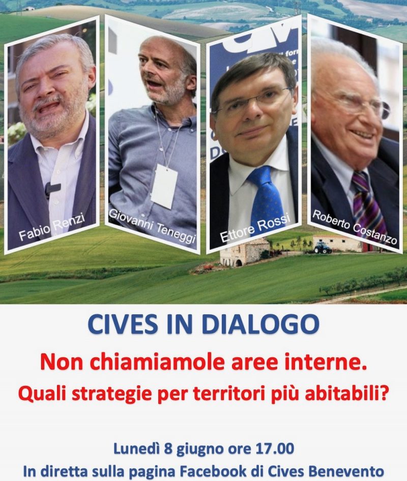Lunedì 8 giugno alle ore 17 CIVES – Laboratorio di formazione al bene comune organizzerà una videoconferenza, nell’ambito del ciclo di iniziative CIVES IN DIALOGO, sul tema: “Non chiamiamole aree interne. Quali strategie per rendere i territori più abitabili?”. Introdurrà Ettore Rossi Coordinatore di CIVES. Dialogheranno: Giovanni Teneggi Responsabile nazionale di Confcooperative per la cooperazione di comunità; Roberto Costanzo Presidente della Fondazione “Mario Vetrone” e Fabio Renzi Segretario generale di Symbola Fondazione per le Qualità Italiane. Sarà possibile seguire la videoconferenza sulla pagina Facebook di Cives Benevento all’indirizzo: https://www.facebook.com/cives.benevento/