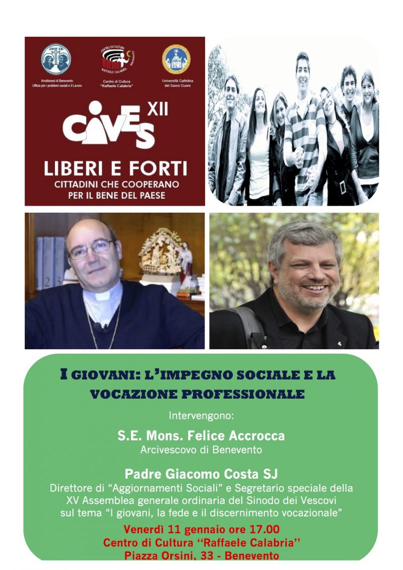 Venerdì 11 gennaio alle ore 17 presso il Centro di Cultura “R. Calabrìa”, in P.zza Orsini 33, si terrà il quarto incontro della dodicesima edizione di “CIVES – Laboratorio di formazione al bene comune” sul tema: I giovani: l’impegno sociale e la vocazione professionale. Relazioneranno: S.E. Mons. Felice Accrocca Arcivescovo di Benevento  e il gesuita Padre Giacomo Costa  Direttore della rivista “Aggiornamenti Sociali” e Segretario speciale della XV Assemblea generale ordinaria del Sinodo dei Vescovi sul tema: “I giovani, la fede e il discernimento”. Il laboratorio CIVES è promosso dall’Ufficio per i problemi sociali e il lavoro della Diocesi di Benevento in collaborazione con il Centro di Cultura “R. Calabria” e l’Università Cattolica del Sacro Cuore.  Il titolo generale dell’edizione 2018 – 2019 è: Liberi e forti. Cittadini che cooperano per il bene del Paese. Il percorso formativo si articola in 13 incontri e in attività laboratoriali. Coordinatore dell’iniziativa formativa è Ettore Rossi Direttore diocesano dell’Ufficio per i problemi sociali e il lavoro, mentre la direzione scientifica è affidata al Prof. Paolo Rizzi dell’Università Cattolica.