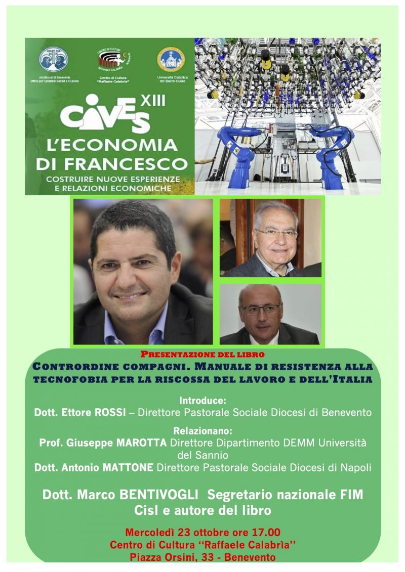 Mercoledì 23 ottobre alle ore 17.00 presso il Centro di Cultura “R. Calabrìa”, in P.zza Orsini 33, si terrà il primo incontro della tredicesima edizione di “CIVES – Laboratorio di formazione al bene comune” con la presentazione del libro di Marco Bentivogli Segretario nazionale della FIM Cisl: Contr’ordine compagni. Manuale di resistenza alla tecnofobia per la riscossa del lavoro e dell’Italia”. Alla tavola rotonda interverranno: Prof. Giuseppe Marotta Direttore DEMM Università del Sannio, Dott. Antonio Mattone Direttore Ufficio di Pastorale Sociale e del Lavoro della Diocesi di Napoli e l’autore Dott. Marco Bentivogli. Introduce Ettore Rossi Direttore dell’Ufficio per i problemi sociali e il lavoro della Diocesi di Benevento.